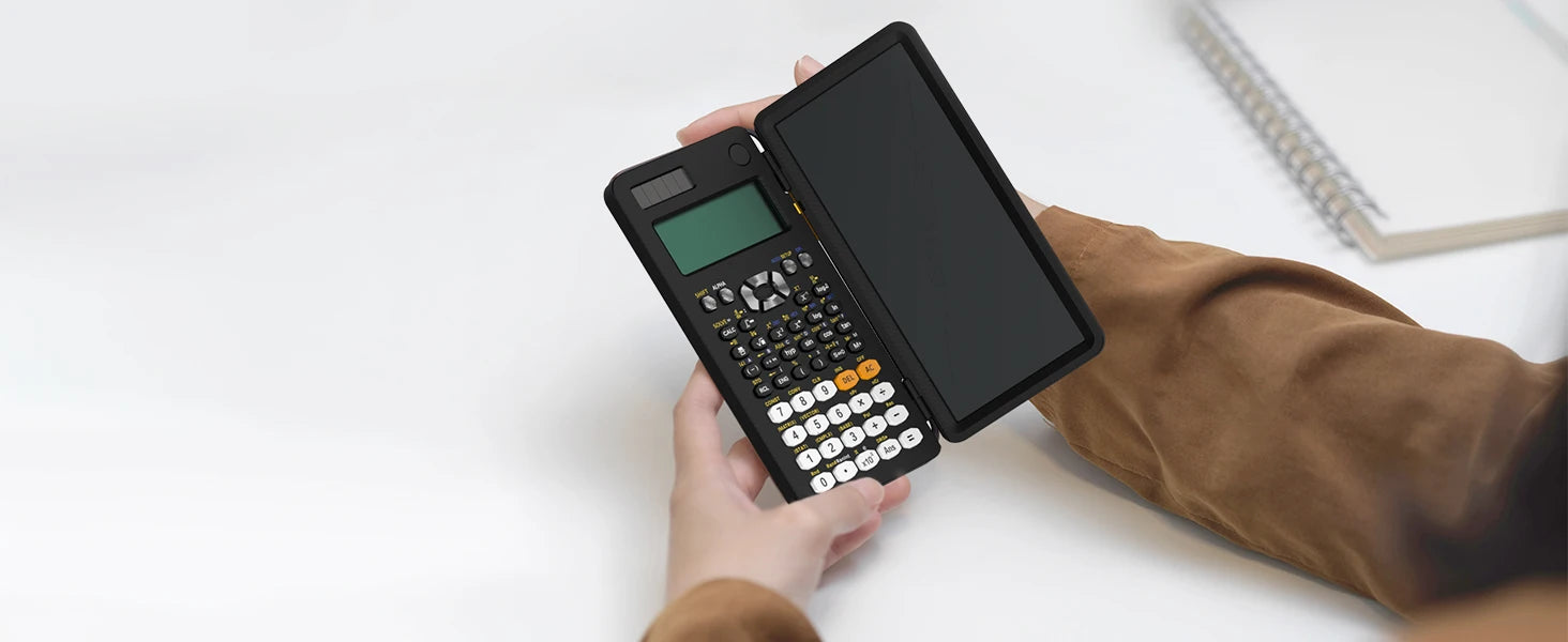 The writing pad allows students and professionals to jot down formulas, solve problems, or make quick notes without a separate notebook — all in one compact tool.
